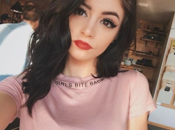 フェミニストを公言しているクリッシー、「女の子は噛みつき返す」と描かれたTシャツを着て。