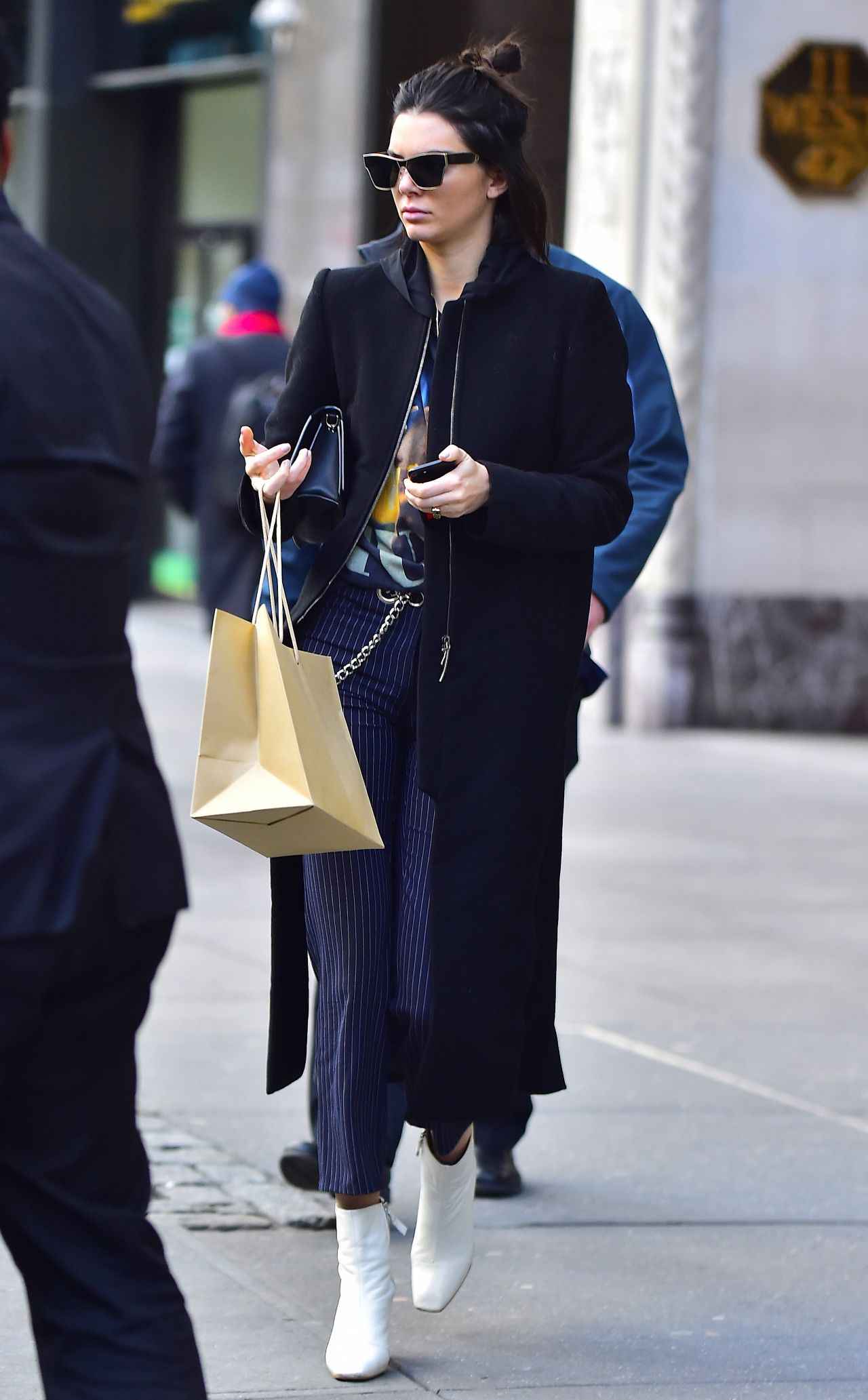 ロックテイストなアーティストTをMiaouのピンストライプデニムで格上げし、ロングコートをON。足元は型の違う白ブーツをいくつも所有しているケンダルが最もヘビロテしているKurt Geigerのブラウンのアクリルヒールのブーツで。