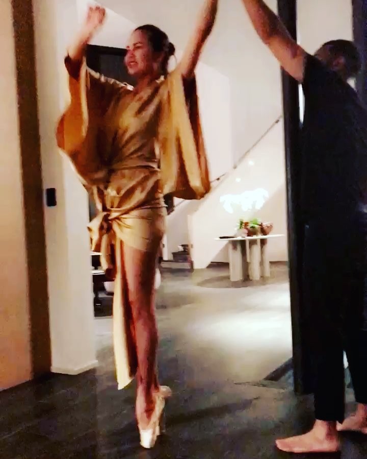 クリッシーはコメントで「小さい頃からバレエを見るのが大好きだったの。数年間にジョンが私のために計画してくれたバレエのパフォーマンスの時にバレエシューズをもらったから、試してみたわ。すごく大変ね。バレリーナの人たち、本当にすごいわ!」とつま先のみで踊るのがどんなに大変かを語り、称賛の声を送った。