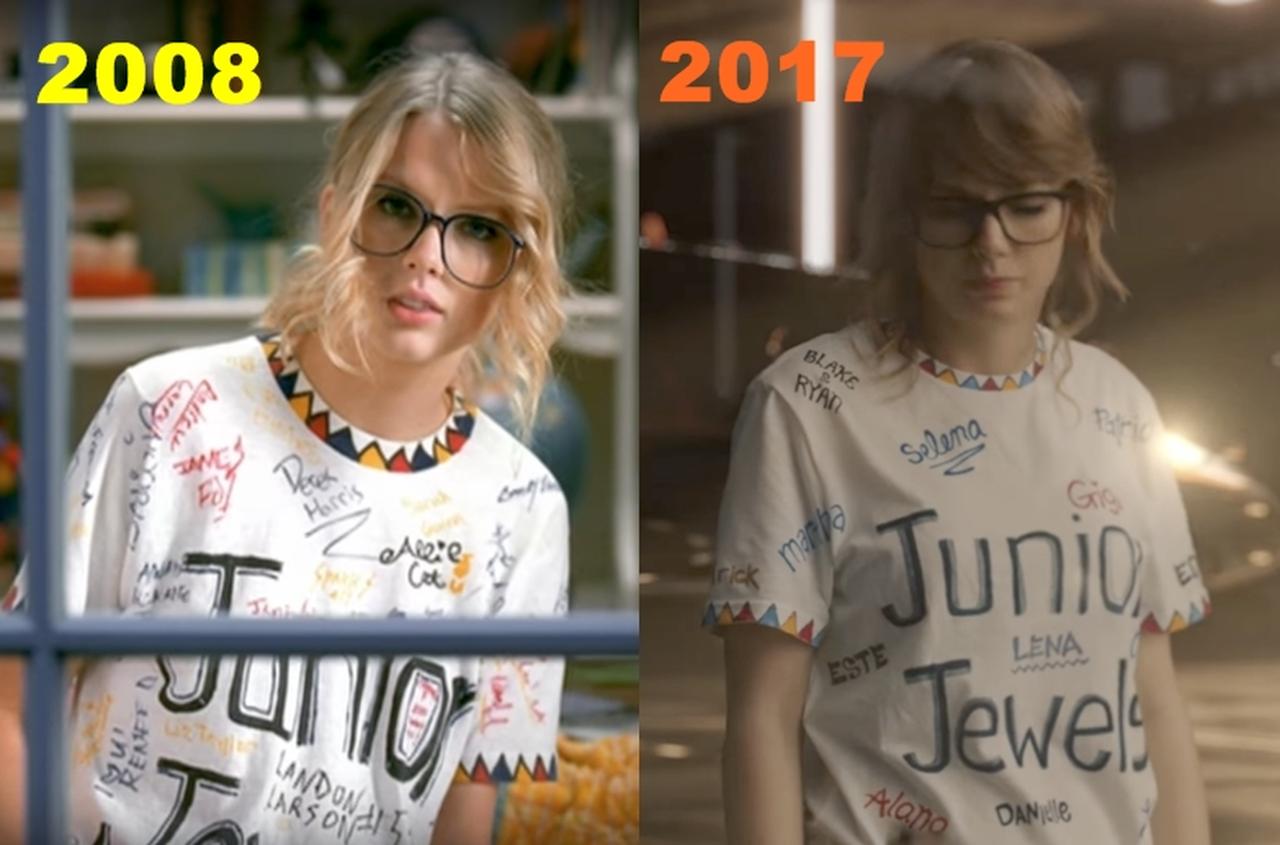 このTシャツは、2008年にリリースされた大ヒットシングル「ユー・ビロング・ウィズ・ミー」のMVでテイラーが着ていたものとまったく同じデザインなのだが、今回のMVではオリジナルとは違い、テイラーの実際の友達の名前がマジックで書かれている。