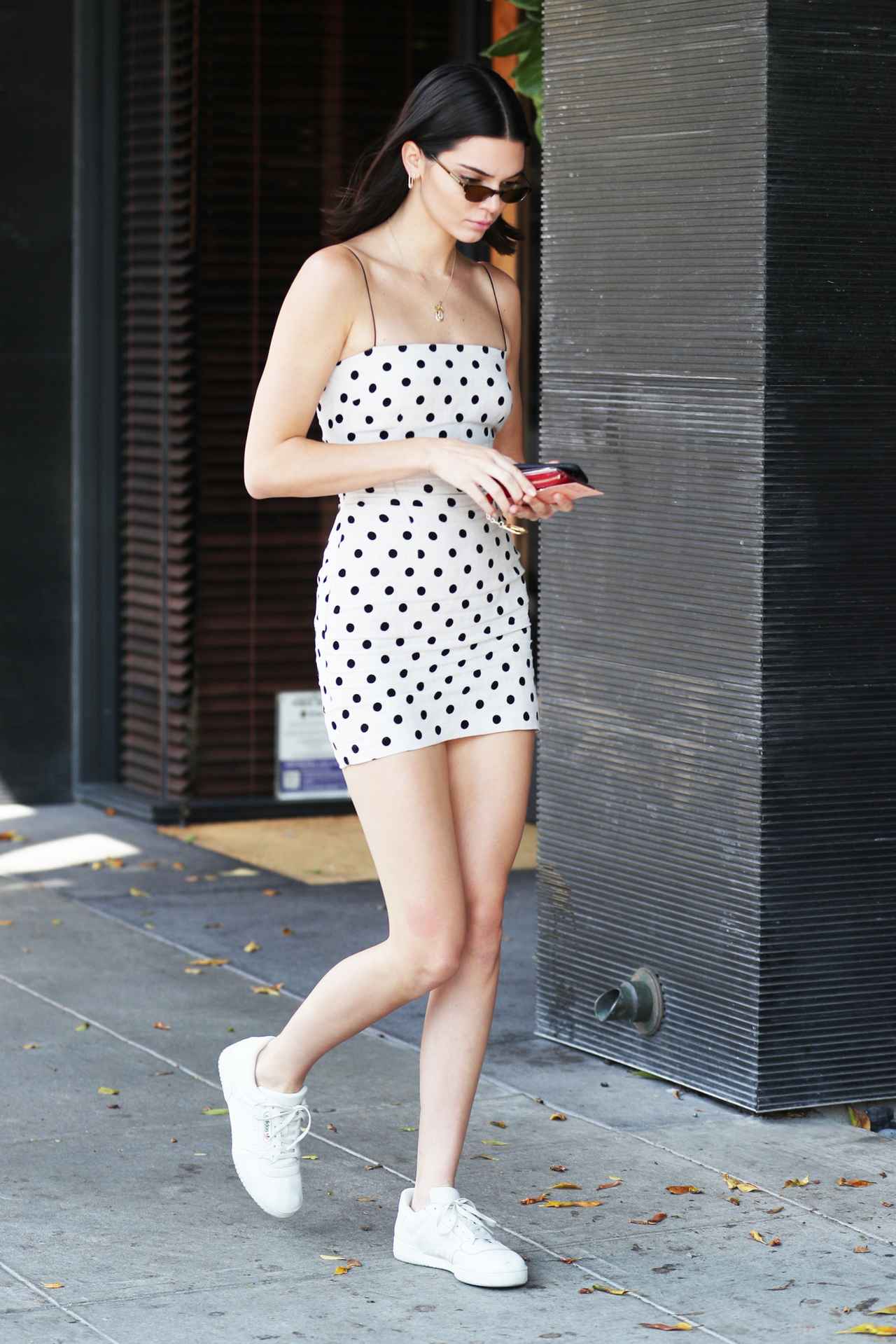 この日のケンダルは、スパゲッティストラップになったドット柄のミニワンピース1枚で登場。そこに義兄でラッパーのカニエ・ウェストが手掛けるブランドyeezyとadidasがコラボしたスニーカーの「カラバサス」をセットして、スポーティさをプラス。