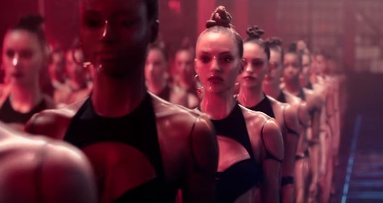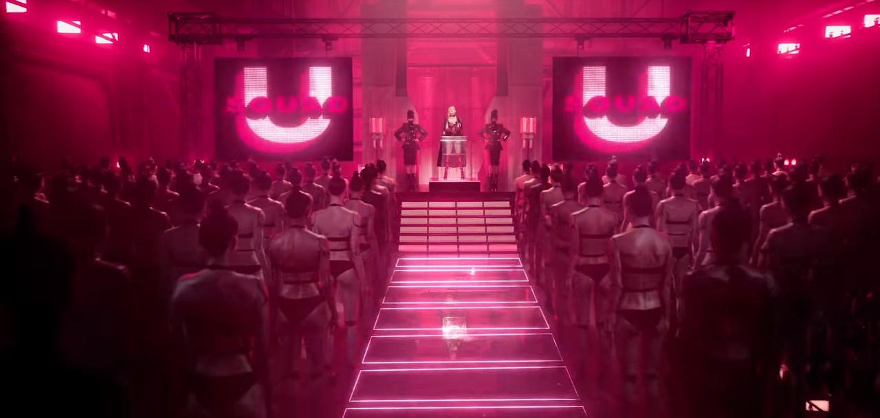 容姿が似ているモデル体型の女性たちが集まったシーンでは、スクリーンに「SQUAD(軍団)」の文字が。