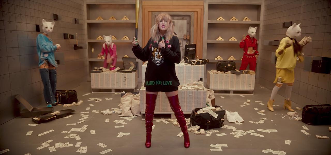 猫の被りものを被り「恋に盲目(BLIND FOR LOVE)」と描かれたトップスを着たテイラーが銀行強盗するシーン。