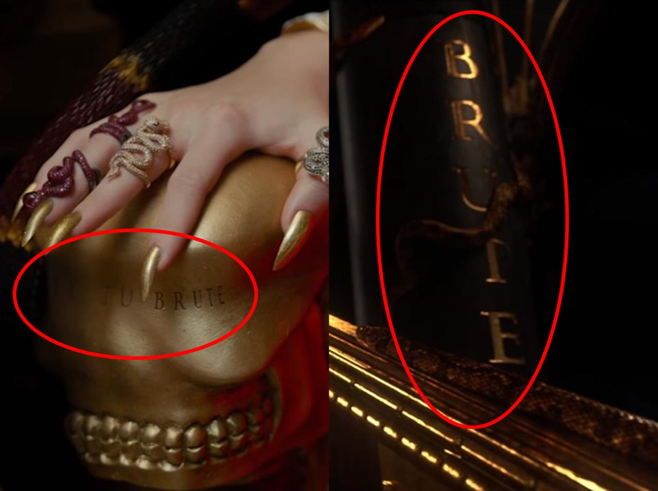テイラーの座る椅子の手すりや階段前の柱に記されている「Et tu Brute」という言葉。