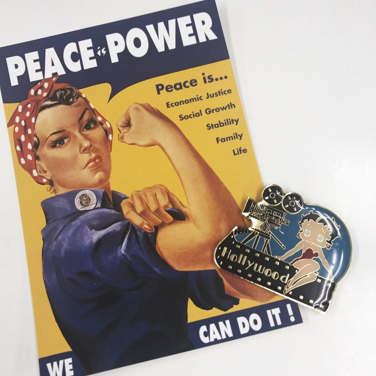 戦時中にアメリカでプロパガンダとして広まったポスターをアレンジし、「PEACE is POWER(平和はパワーだ)」と描かれたポストカードと、ベティ・ブープのマグネット。