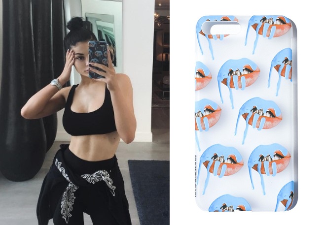 リアリティスターのカイリーは、自身のブランドTHEKYLIESHOP(ザ・カイリーショップ)から、アイスブルーのリップをつけた唇がインパクトのあるスマホケースをチョイス。