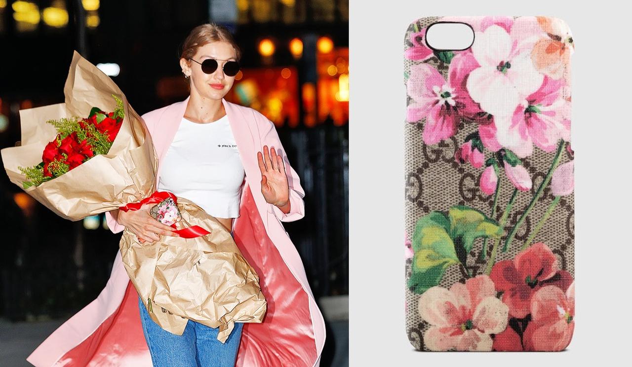 モデルのジジは、GUCCI(グッチ)の定番ロゴの上にピンクと赤の花が描かれた華やかなスマホケースを。