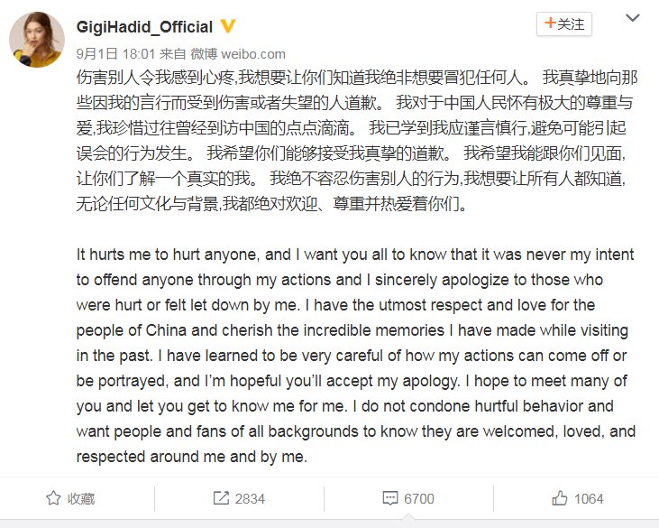 その理由は、ジジが世界中のユーザーの目に留まりやすいツイッターやインスタグラムなどのメジャーなSNSには謝罪の投稿をせず、中国をベースとするウェイボ―のみに声明を投稿したから。