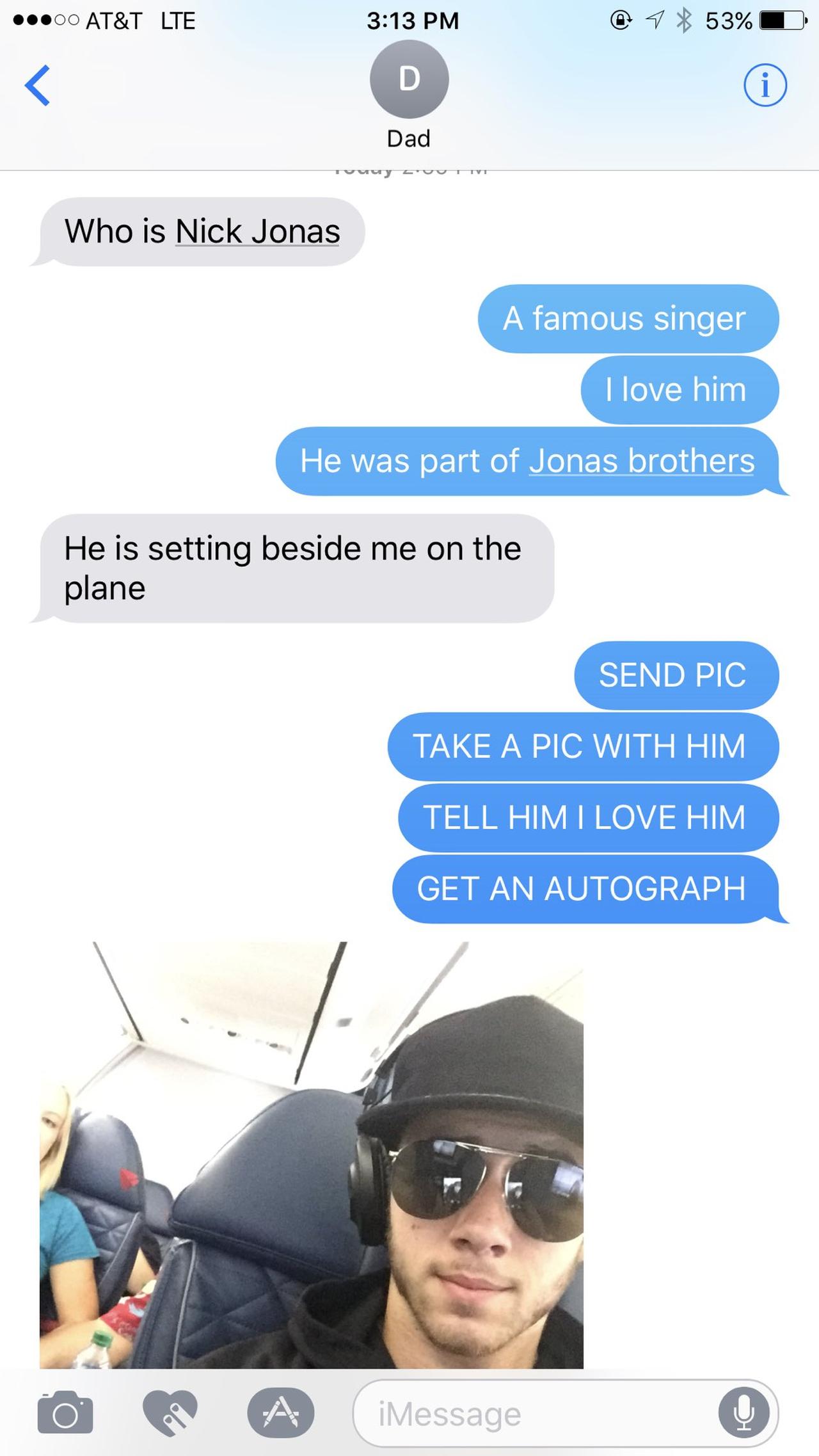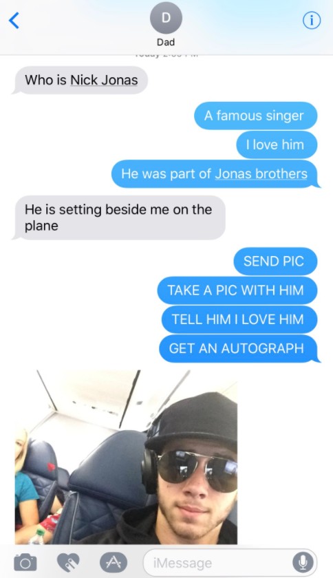 デルタ航空のファーストクラスでのフライト中に、突然ある父親が娘に「ニック・ジョナスって誰?」というメールを送信。