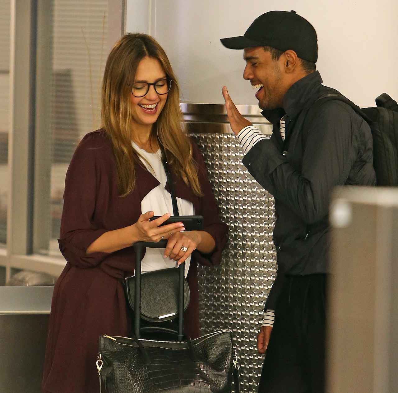 Pregnant Jessica Alba touches down at JFK airport in New York with a friend for Fashion Week and were spotted laughing on there phone while waiting for there luggage.