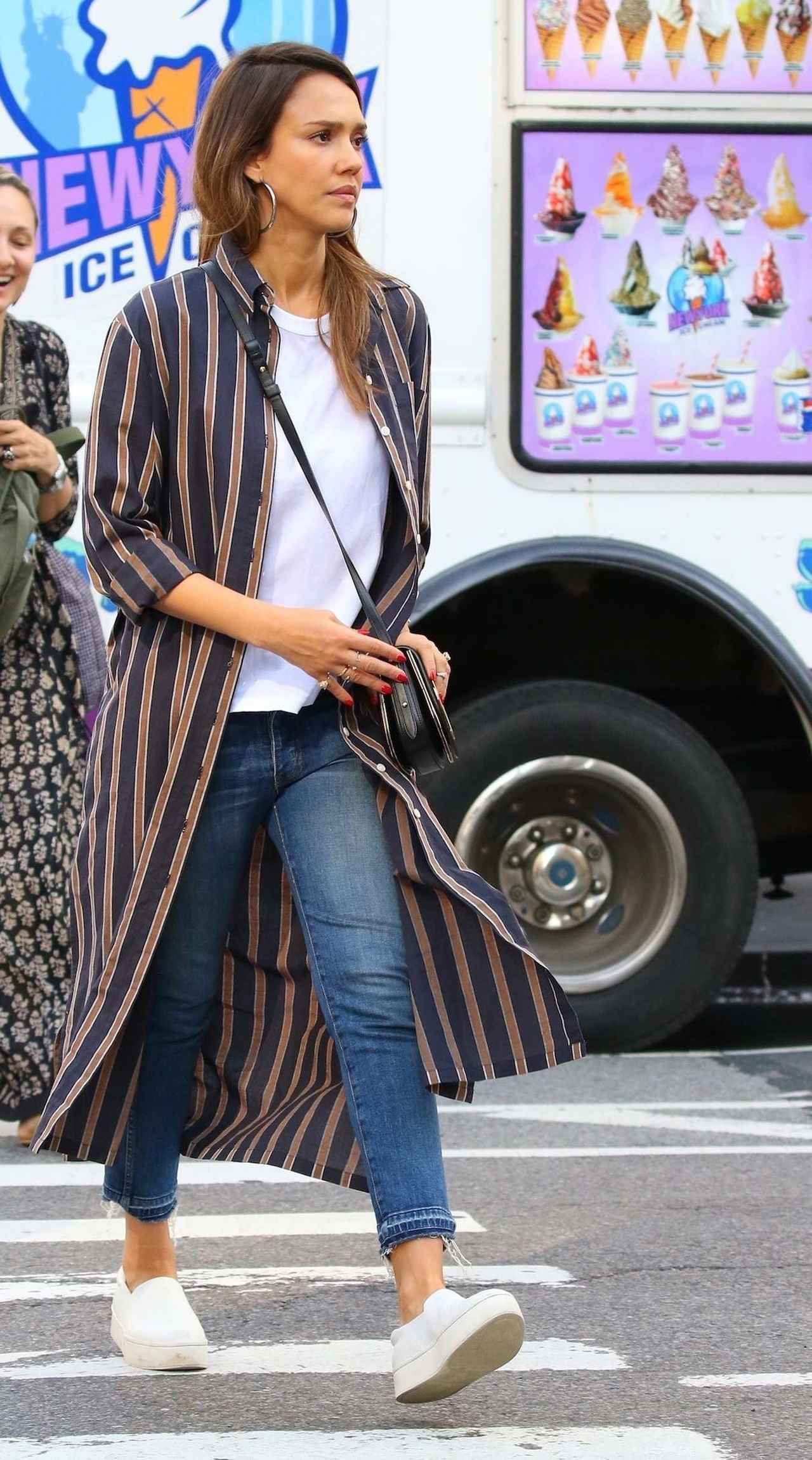 人気女優のジェシカ・アルバは、ネイビーとブラウンのストライプ・プリントがシックな、シャツタイプのガウンをプライベートで愛用中。フロントをしめればワンピースとして着用できる2Wayで、幅広いシーズンで使える人気のタイプ。人気続行中の白スニーカーは、プラットフォームが旬顔。