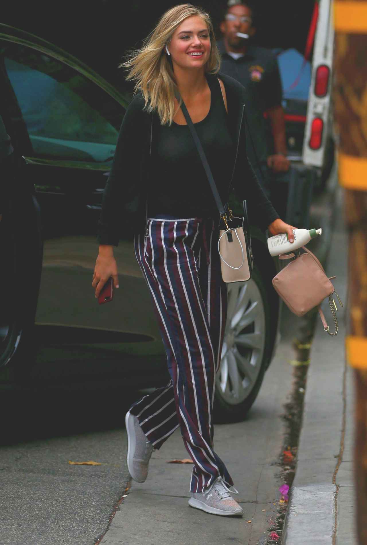 モデル、女優として人気のケイト・アプトンは、ブラックフーディーのカジュアルなトップスに、Nina Ricciの秋らしいカラーのストライプ柄パンツを合わせ、スタイルを格上げ。バッグはCeline。