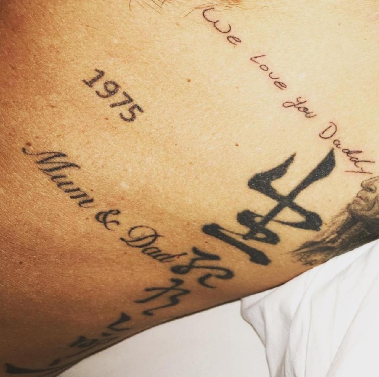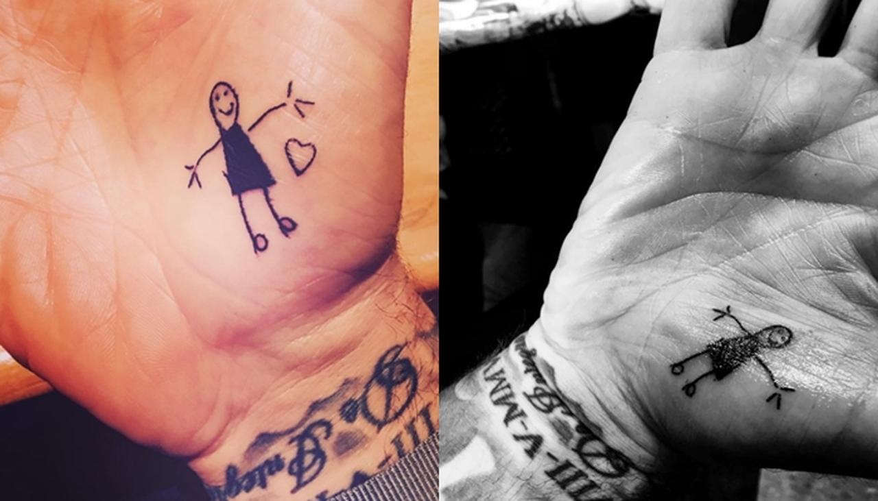 デイビッドは、現在6歳の娘ハーパーちゃんが4歳の頃に彼の手のひらに書いた棒人間のお絵描きをそのままタトゥーにしているほか、脇腹には長男のブルックリン、次男のロメオ、三男のクルズが共同で書いた「We Love You Daddy(パパ愛してるよ)」というメッセージもタトゥーとして彫っている。