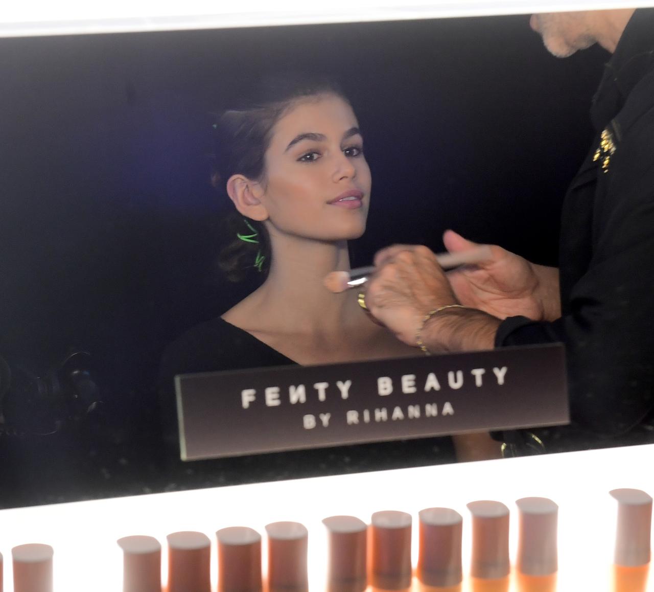 フェンティ プーマの舞台裏では、2016年の世界一稼ぐモデルランキング2位のアドリアナ・リマがヘアメイクをするカイアのもとへ。アドリアナらしい明るさでカイアを激励していた。
