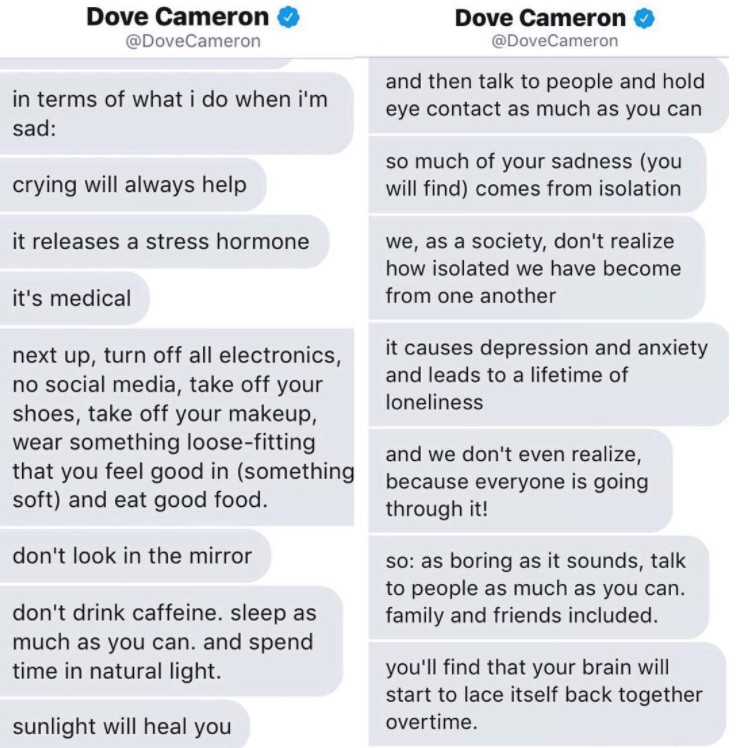 全米ティーンの間で話題沸騰中のディズニー・チャンネルのテレビ映画『ディセンダント2』に出演している女優のダヴ・キャメロンが、うつや不安に悩んでいるというあるファンを勇気づけるため、インスタグラムのダイレクトメッセージ(以下DM)を通じてアドバイスを送った。