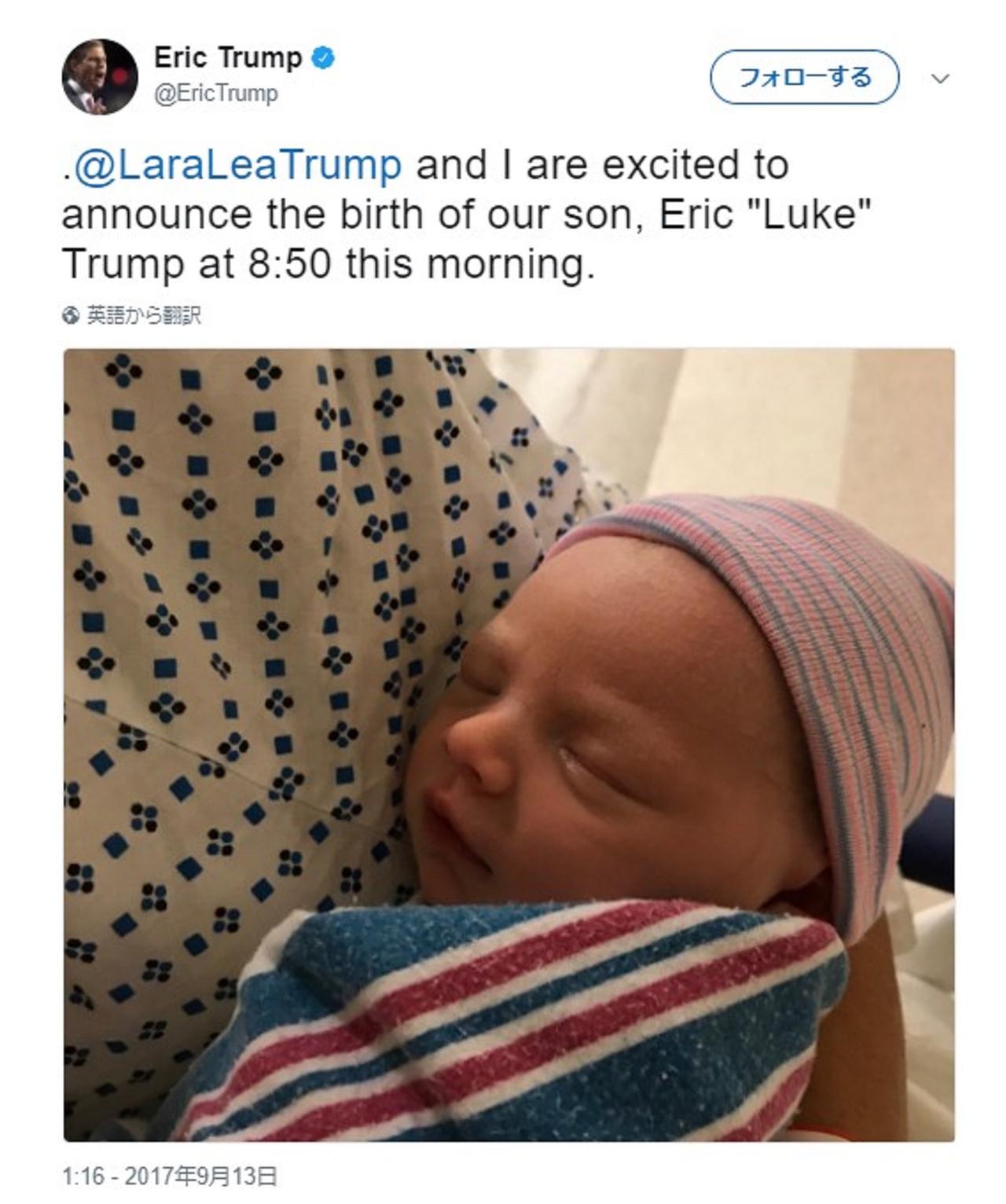 エリック氏はツイッターを通じて、トランプ家に新に加わった自身初となるベビーの名前が「エリック・“ルーク”・トランプ」くんに決定したことを、産まれたばかりのルーク君の写真を添えて発表した。