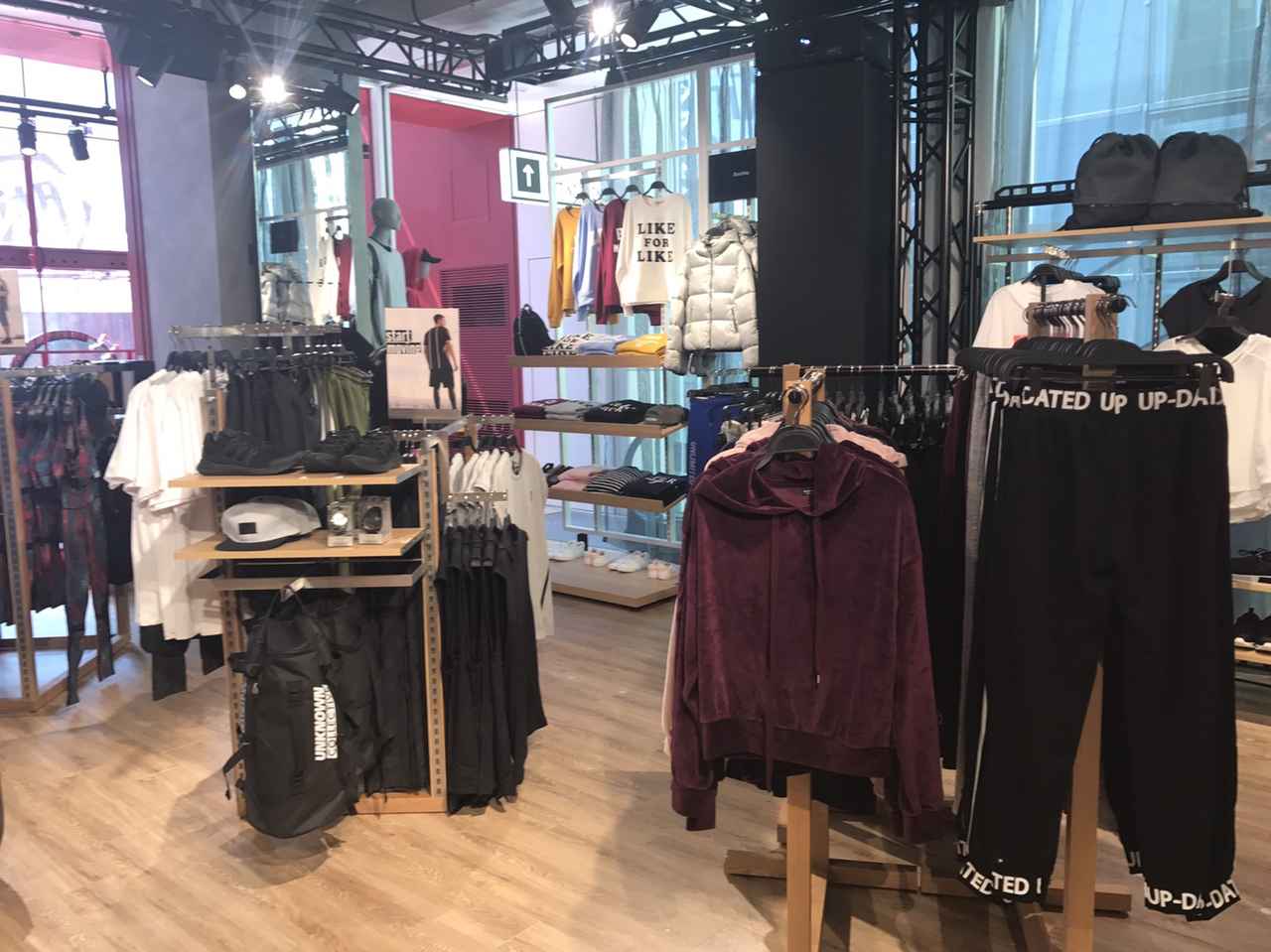 運動する時に着るスポーツウェアも発見。文字が入ったスポーティ-なものが目立つなか、ベーシックなアイテムもしっかりと展開している。オシャレなスポーツウェアを着て運動したいという人は必見のコーナー。