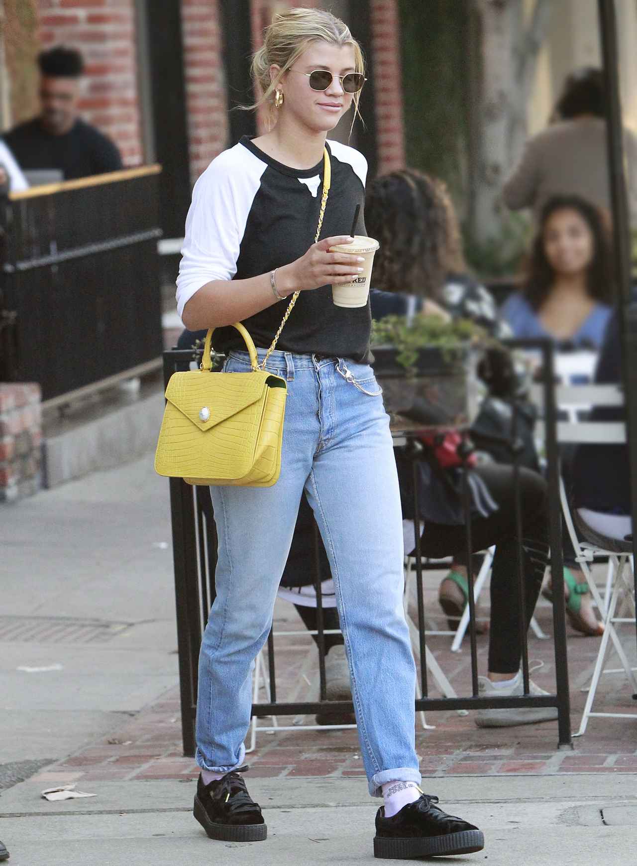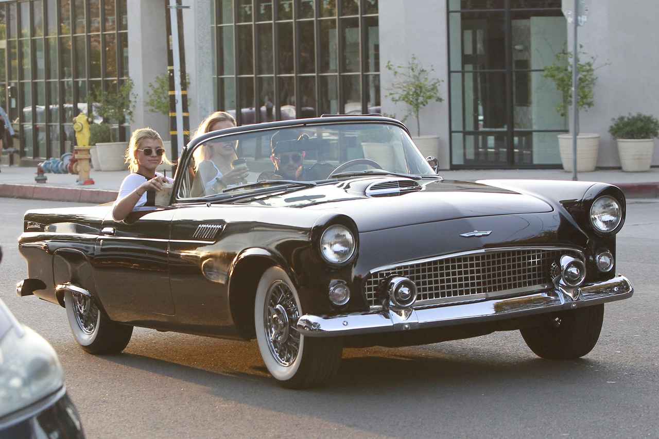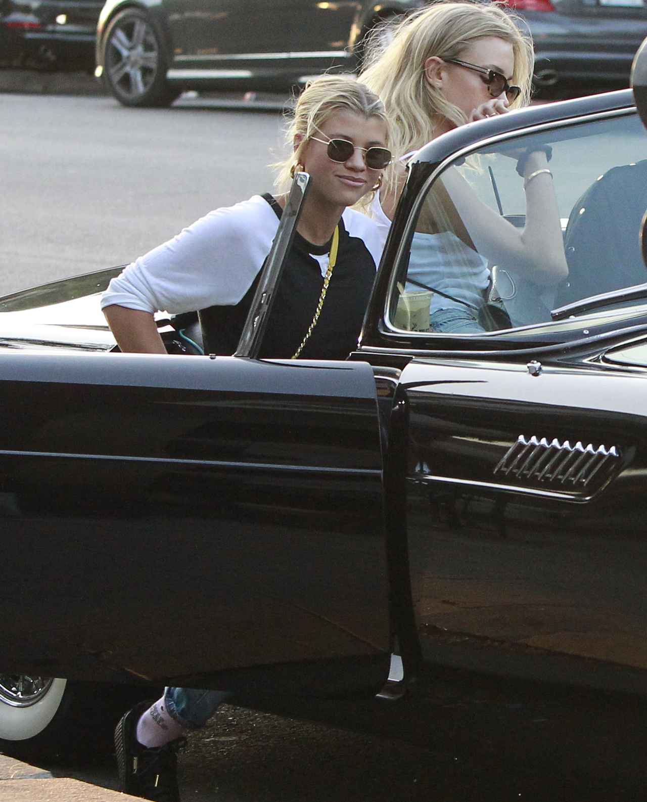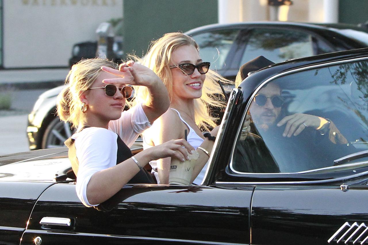 イエローのバッグを差し色にしたカジュアルなスタイルで友達と外出していたソフィアは、カメラに気づくと手を振り、その先には友人が運転するクラシカルなアメ車が。