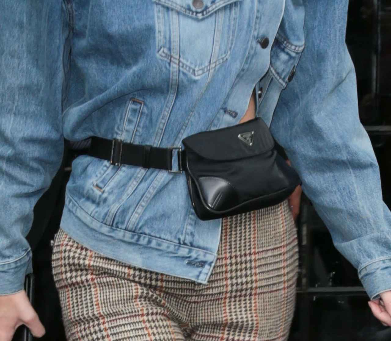 オーバーサイズなデニムジャケットを、ケンダルが溺愛しているウエストポーチでしっかりとマークしたのが技あり。