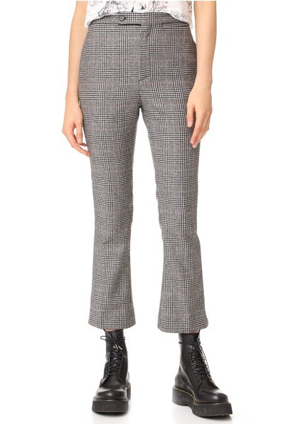 ケンダルが最近着回しているこの建築的なデニムジャケットは、BALENCIAGAのもの。アシンメトリーにクロスオーバーされたフロントは、まさに最旬デザイン。そこにチェック柄のフレアパンツをセットして、トラッド風に。