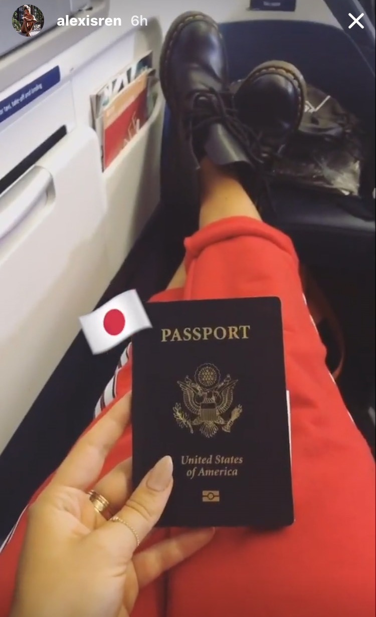先ほどアレクシスは、飛行機の機内で撮られた写真に日本の国旗の絵文字がついたものを自身のインスタグラムに投稿。