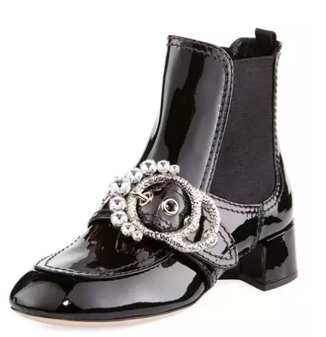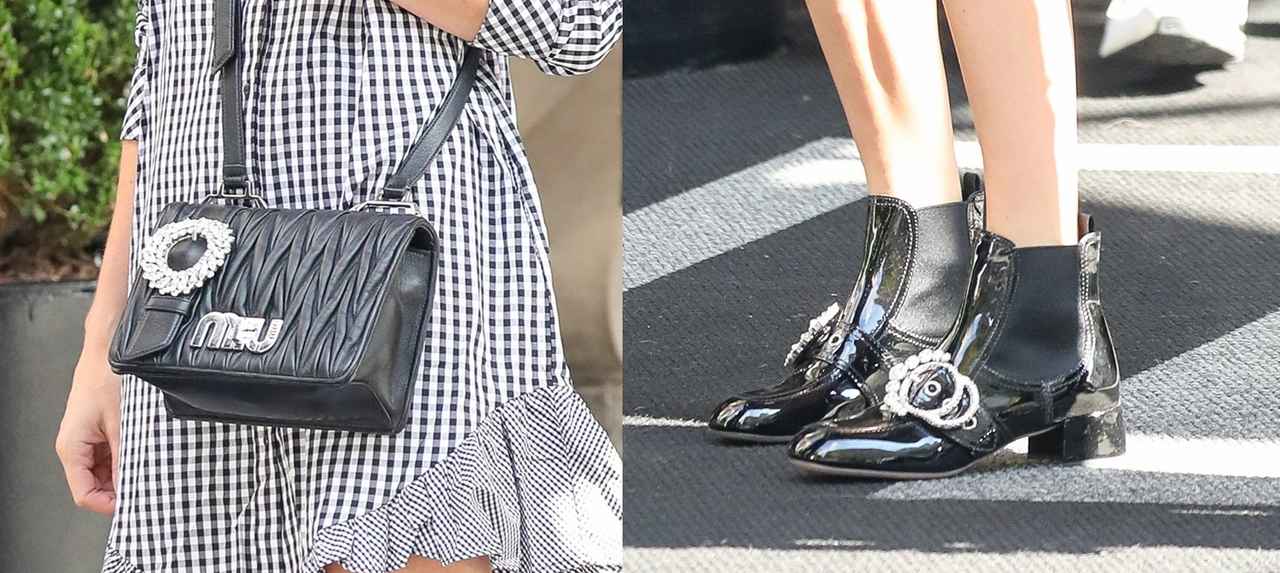 そこにバッグと靴はケイトお気に入りブランドmiu miuで統一。黒レザーにクリスタルの飾りがついて、シックな要素をプラスしてくれる。