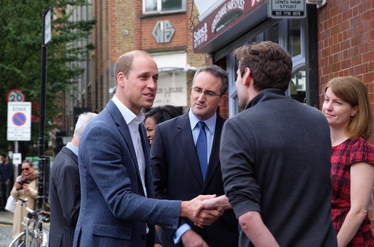 ホームレスやドラッグ中毒者などの社会復帰をサポートするために設置された街のコーヒーショップを訪問したウィリアム王子は、外でその様子を見物していた、隣接する理髪店のスタッフたちにも気さくに挨拶。