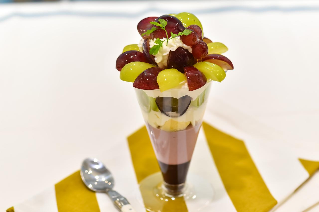 ピオーネ、マスカット、デラウェアなどがトッピングされた豪華なパフェ。