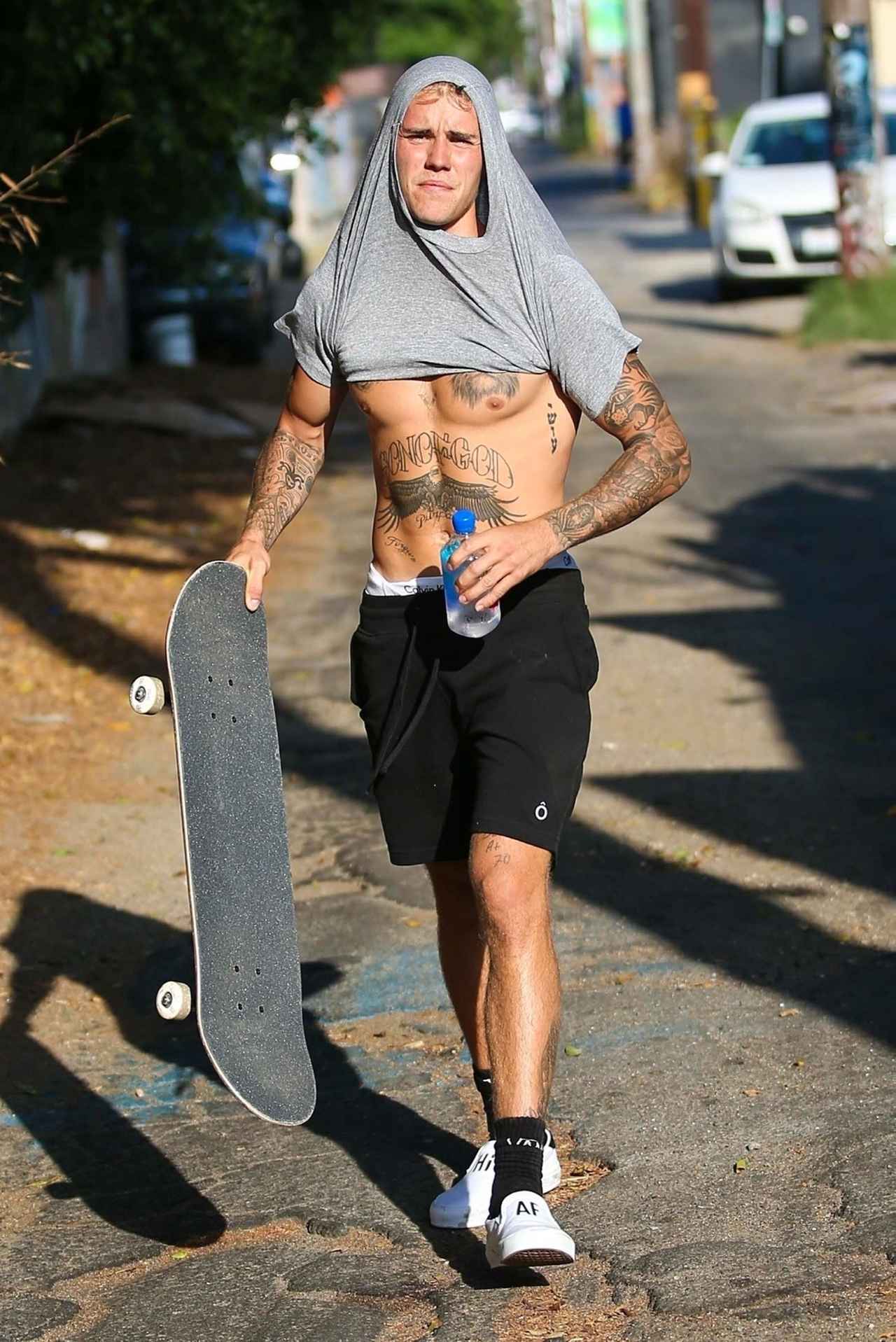 この日、グレーのTシャツにブラックのハーフパンツというカジュアルな装いで、スケートボードをするためにウェストハリウッドを訪れたジャスティン。けれど、なんかTシャツの着かたがちょっと変…。