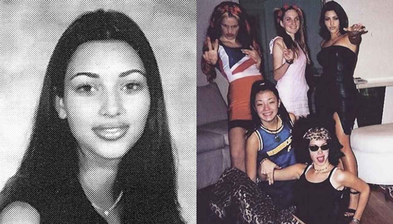 高校生時代のキム。右は文化祭で友人たちとスパイス・ガールズのコスプレをした際の写真。上段右がキム。