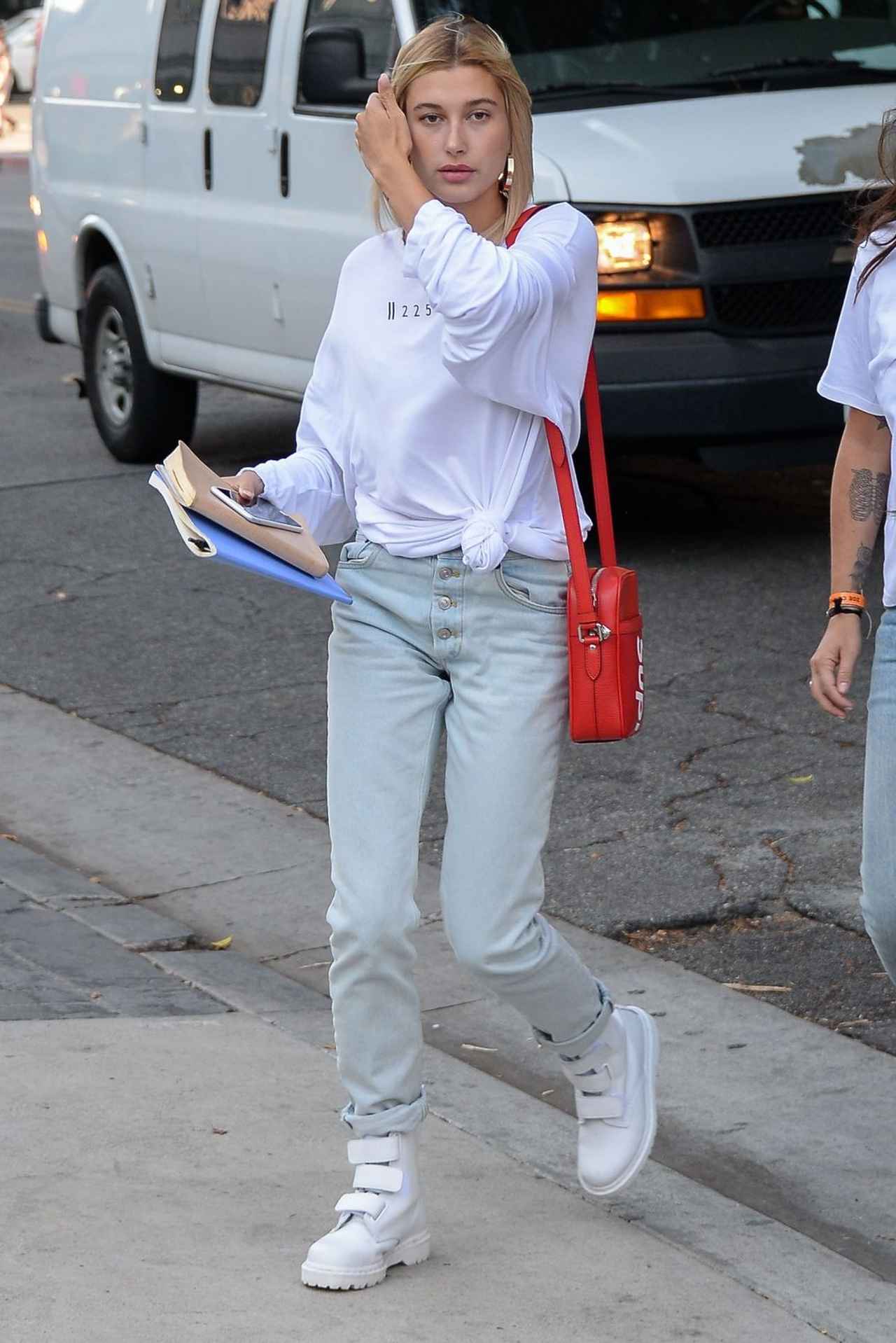 ストレートデニムに白のロンTの裾を縛ってバランスを取った、カジュアルスタイルが得意なヘイリー。話題のSupreme X Louis Vuittonの真っ赤なショルダーバッグを差し色にアクセントを置いて。