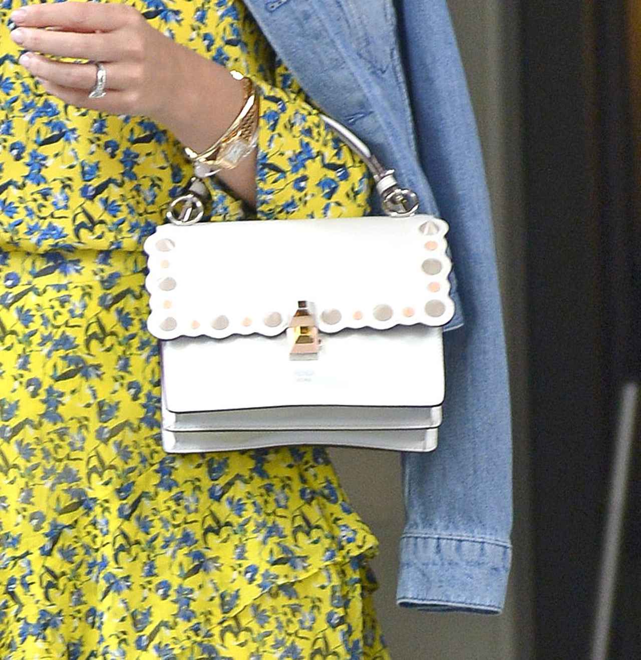 足元はシルバーのストラップサンダルで華奢に、さらにバッグはミランダが最近ヘビロテしているFENDIのミニハンドバッグでレディな要素をプラス。