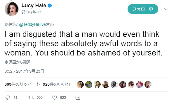 それでも怒りが治まらなかったルーシーは、この男性のツイートをスクリーンショットして、インスタグラムストーリーに、「全ての男性へ、絶対に、絶対に、女性に対してこんな口のきき方をしないでちょうだい」とのコメント付きでアップした。