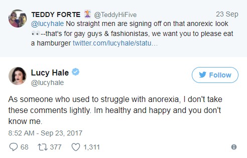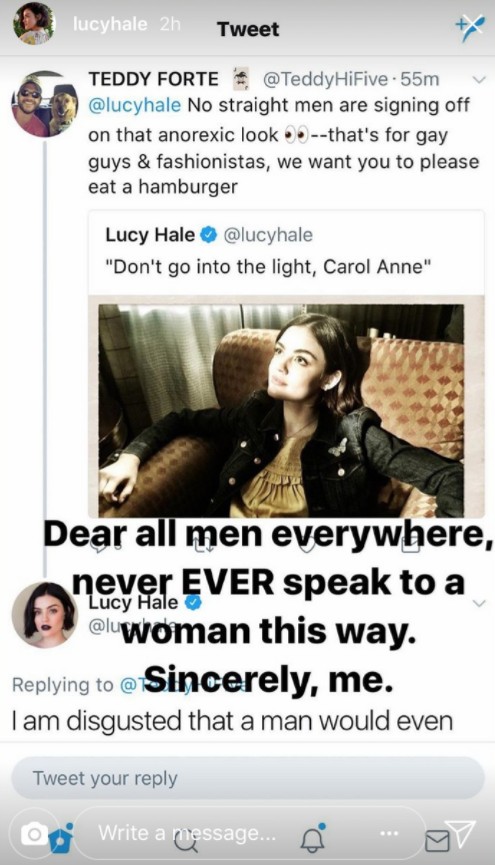 ドラマ『プリティ・リトル・ライアーズ』のルーシー・ヘイルが、ツイッターで男性に拒食症みたいと言われ、ブチ切れ。