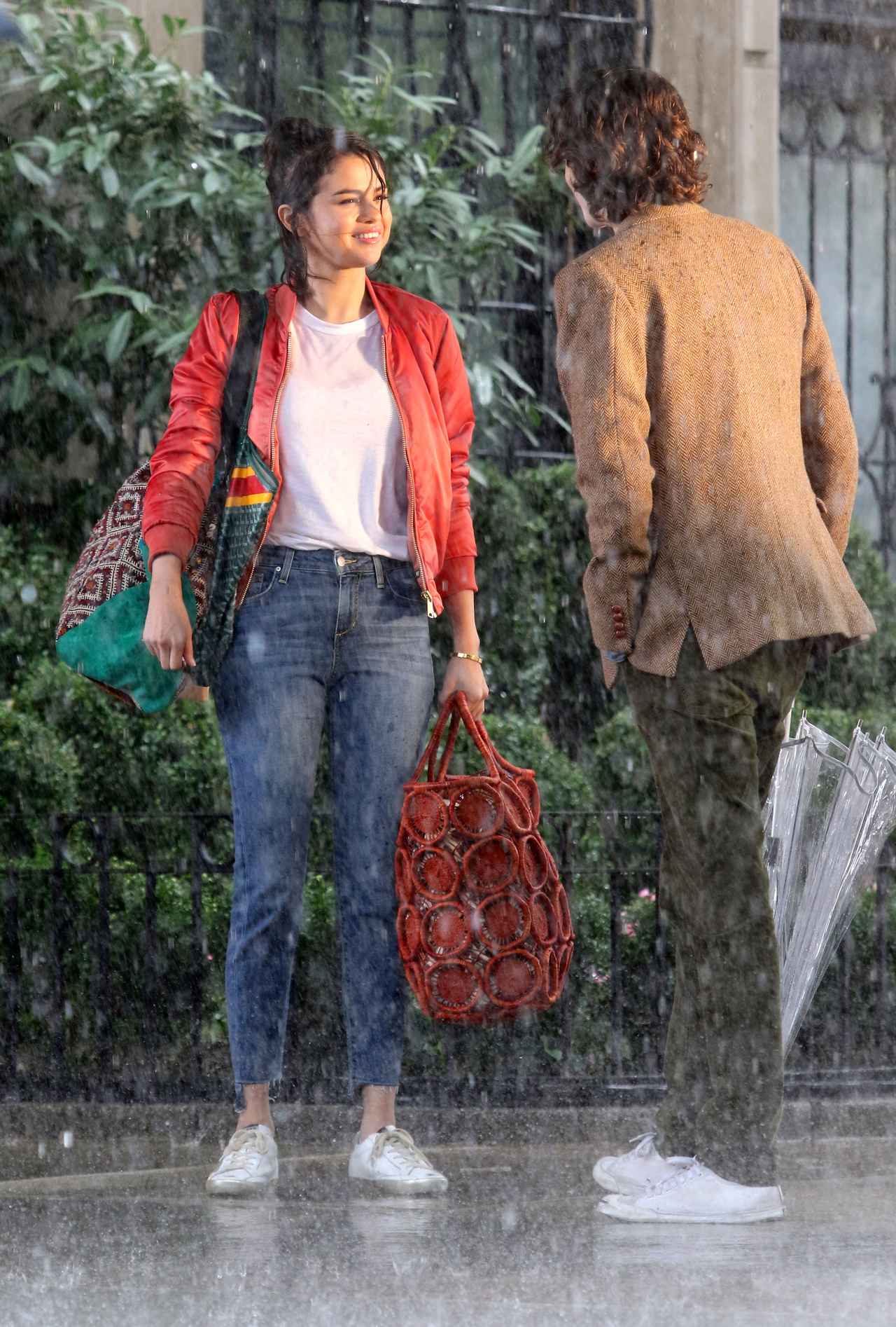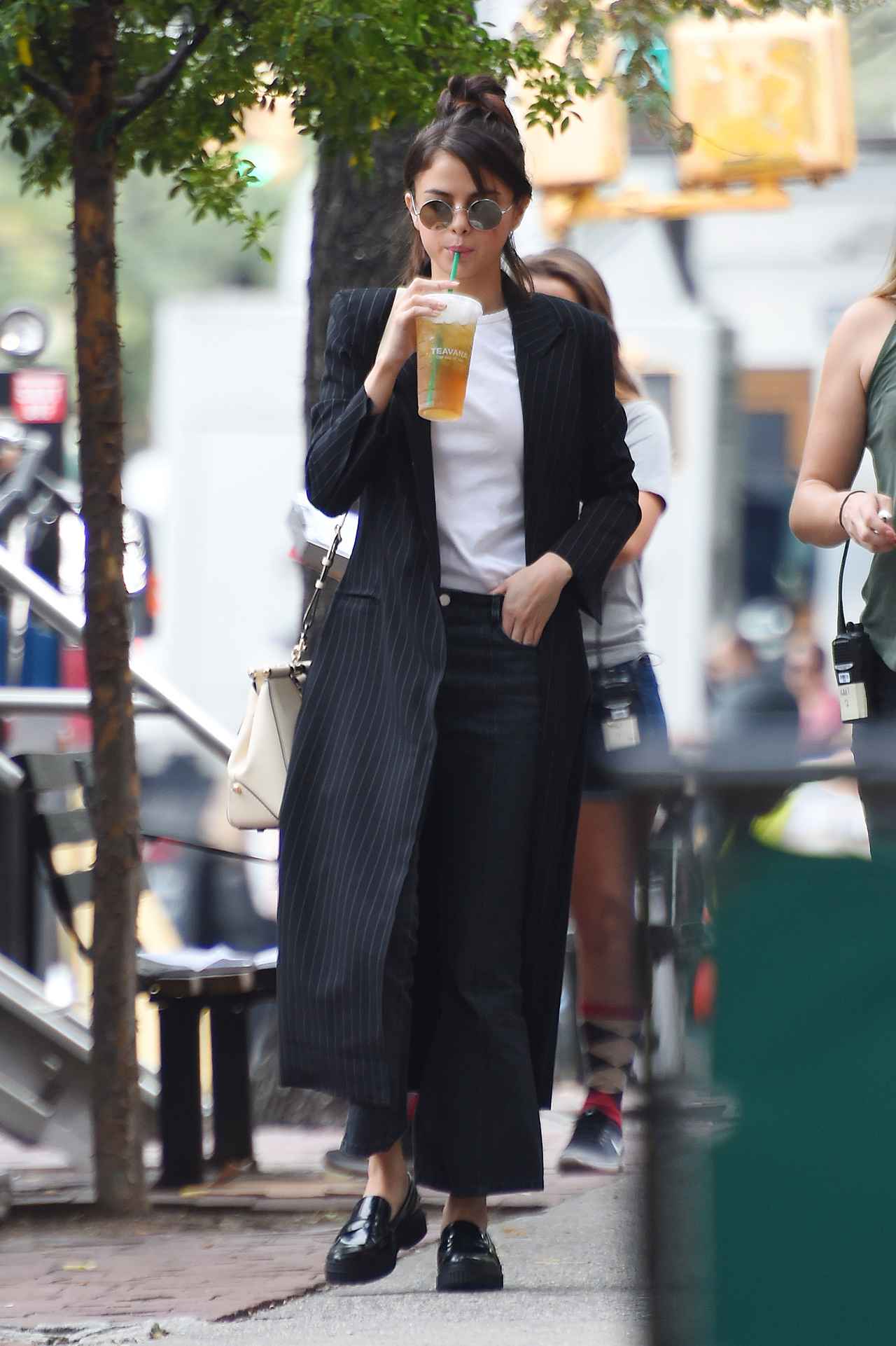 Selena Gomez sips on her morning tea as she walks between trailers on the set of the Woody Allen movie in New York City, New York.