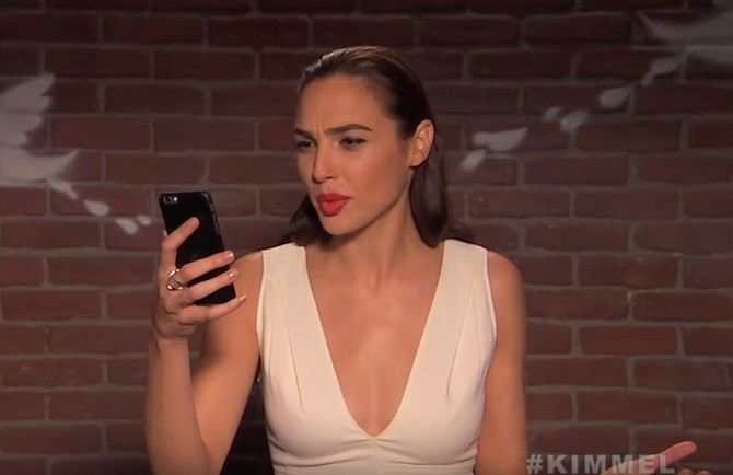 眉間にしわを寄せた表情で「ガル・ガドット? なぜ彼女にはおっぱいがないのだろう」というコメントを読み上げると、自身の胸を見ながら「ここにあるわよ、心配しないで」とバッサリ切り捨てた。