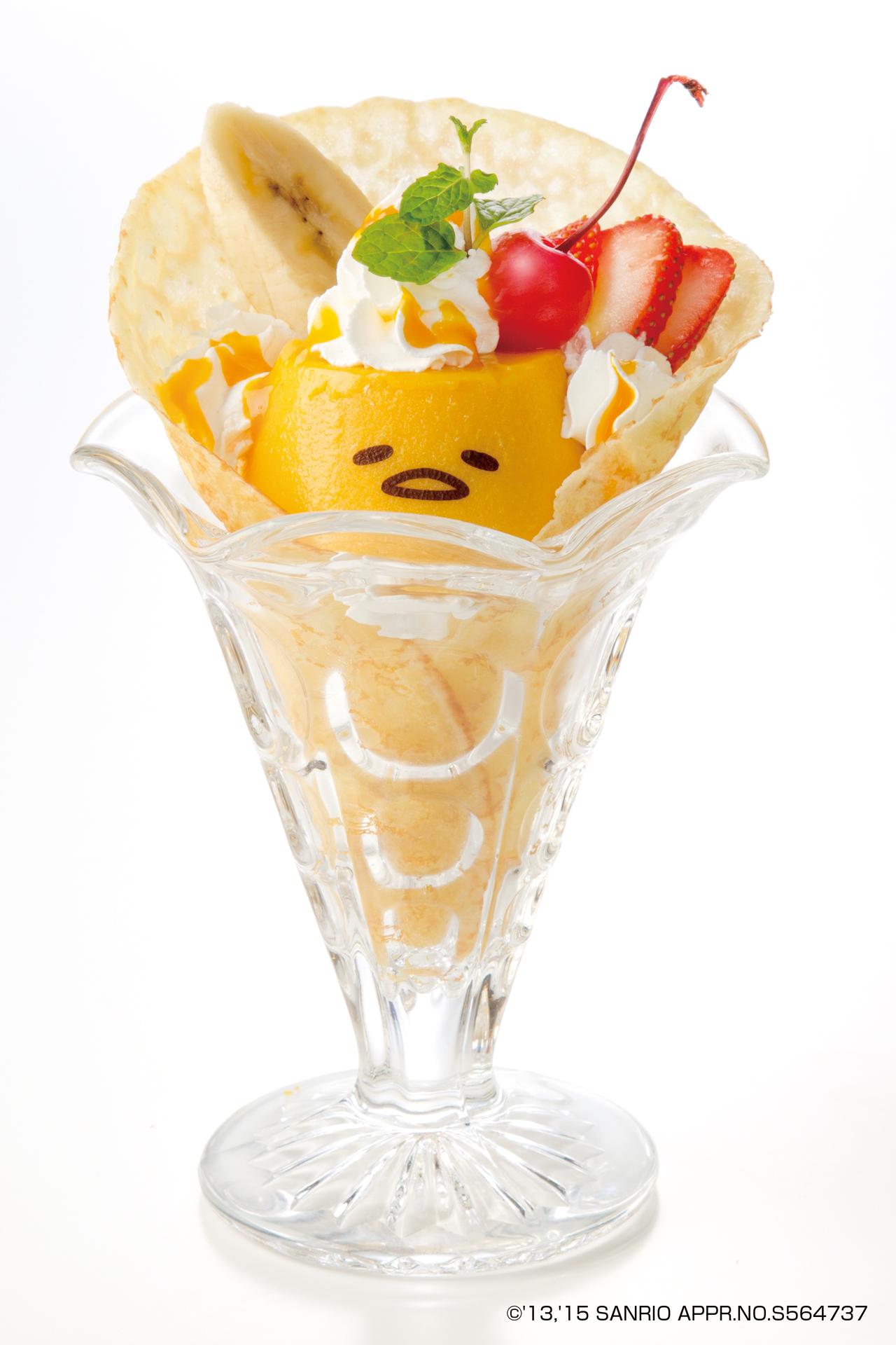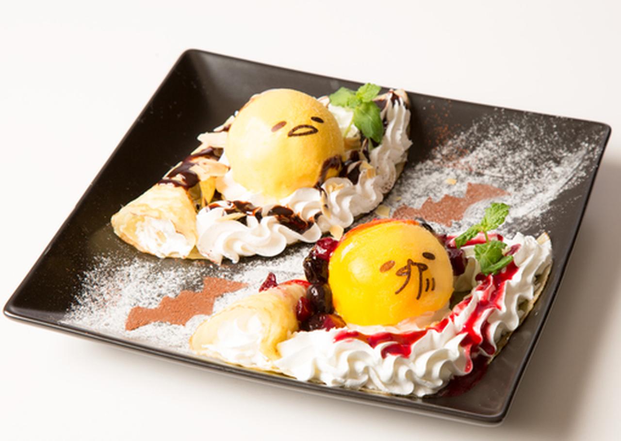 かぼちゃのアイスとマンゴ~アイスになった“ぐでたま”が、クレープの上でゆる~いハロウィンパーティ。アイス+チョコソ~ス・ベリ~ソースWithふわふわホイップクリ~ムのクレープはシンプルながら絶品。2つのクレープの味が同時に楽しめる。