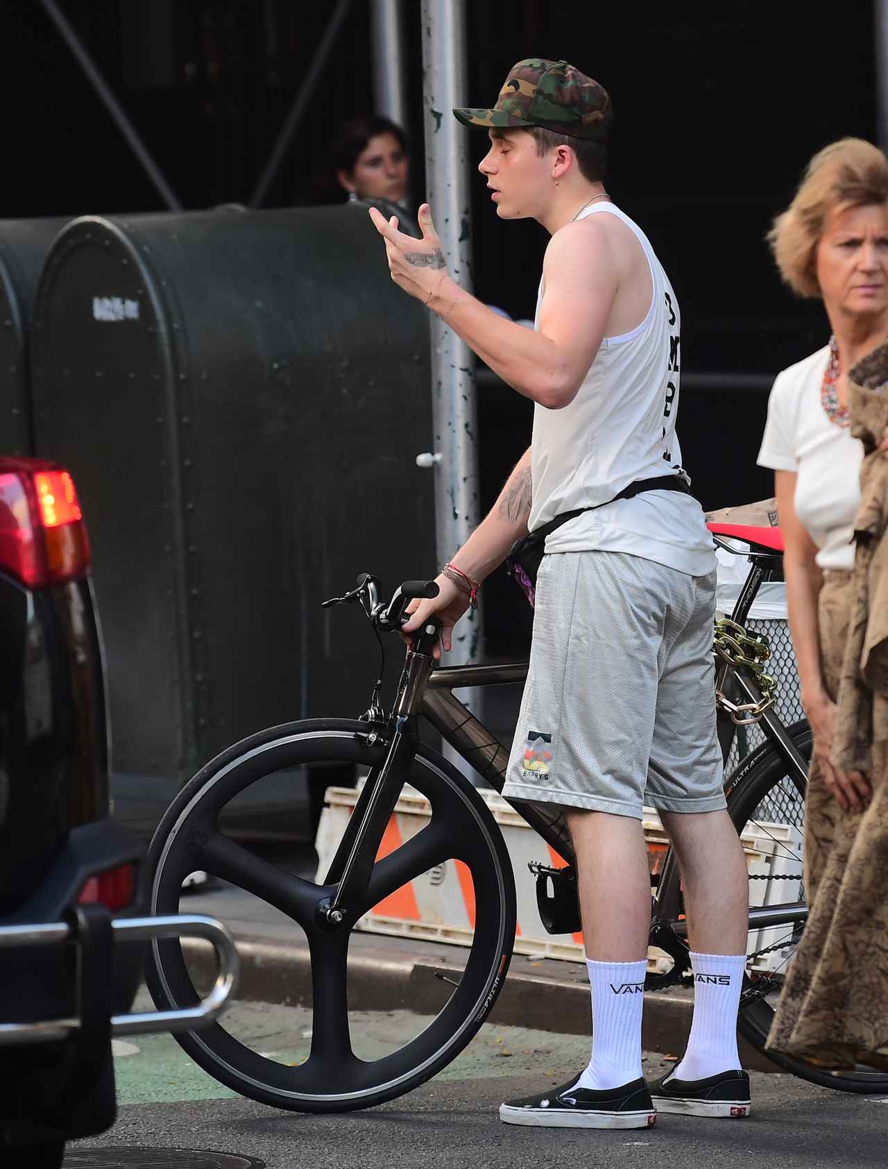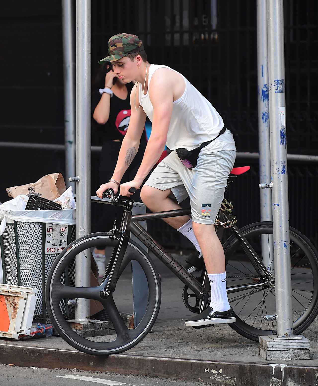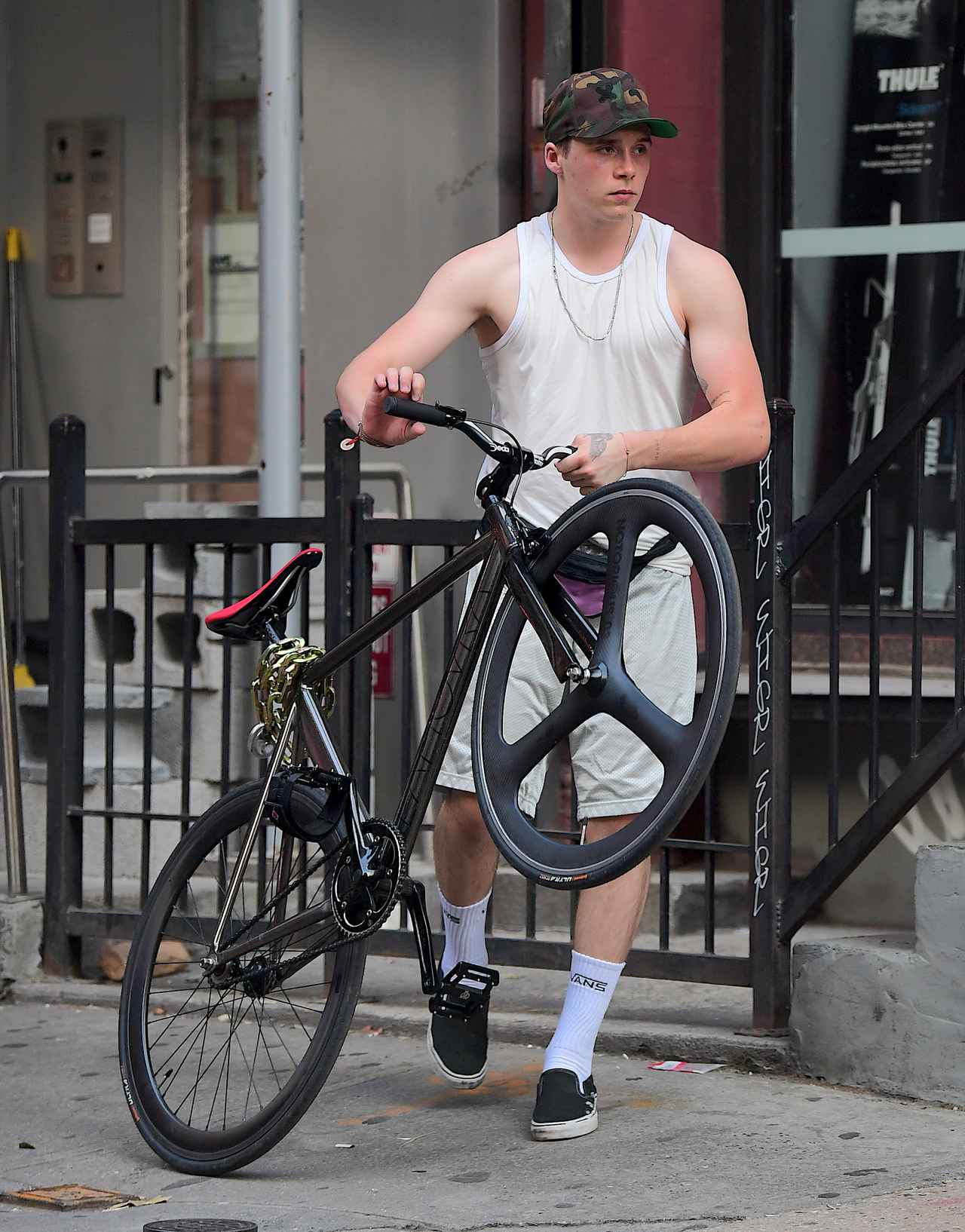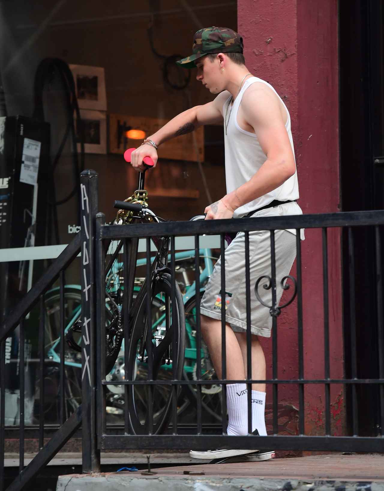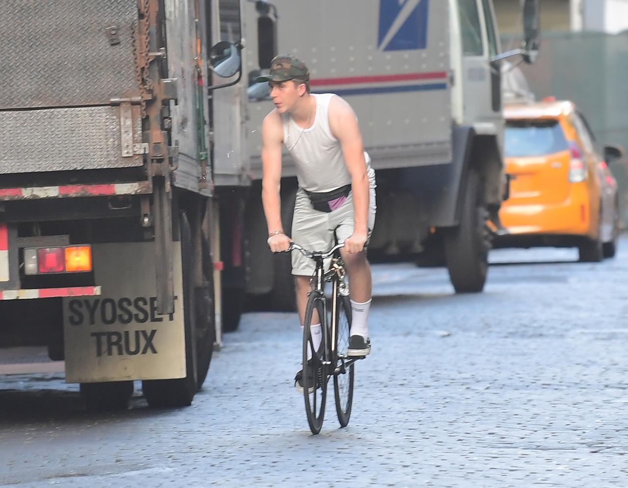 現在、実家を離れてニューヨークで1人暮らしをしているブルックリン・ベッカムが、自転車に乗っている姿をフロントロウ編集部が激写。