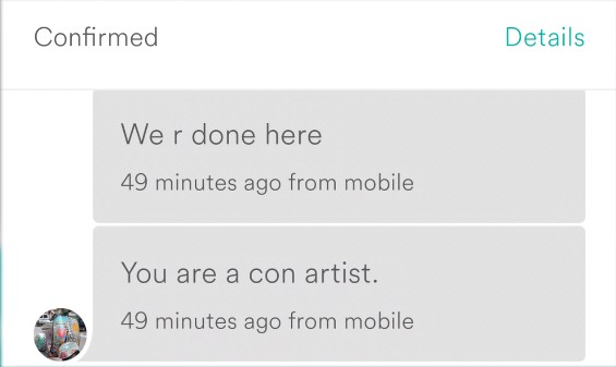 その後もう一度ダインは、お金はいくら払うのかとの確認メールを送ると、相手は「こんな忙しい週末に4人の人間と2匹の犬が泊まれると思ってるなんて、頭おかしいんじゃないの」との返信が。さらに「もう終わり。この詐欺師が」と言って、勝手に予約をキャンセル。