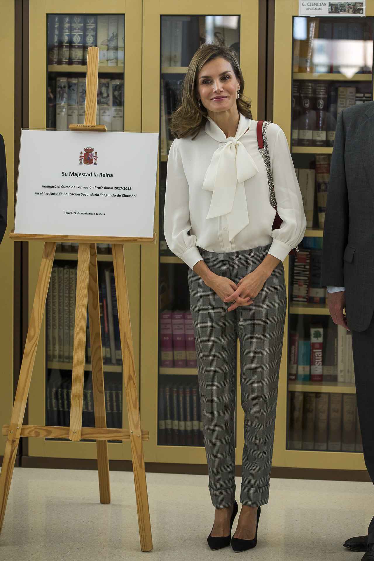 トレンドのグレンチェック柄のパンツに白のボウタイシャツをセットして、マニッシュなパンツをエレガントに昇華したレティシア王妃。シャツの袖はバルーンスリーブになっており、しっかりトレンドも意識。