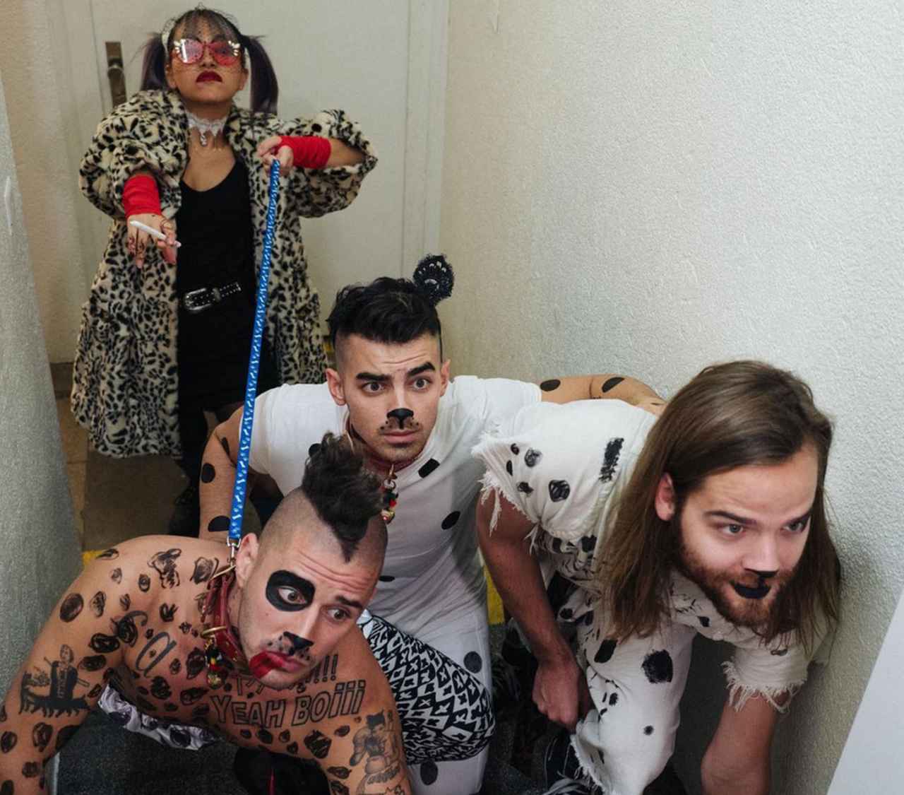 メンバーの仲の良さで知られるDNCEは、ジンジョーが『101匹わんちゃん』の悪役クルエラに変身。男性メンバーの(左から)コール、ジョー、ジャックがダルメシアンになるという、コミカルな写真に。