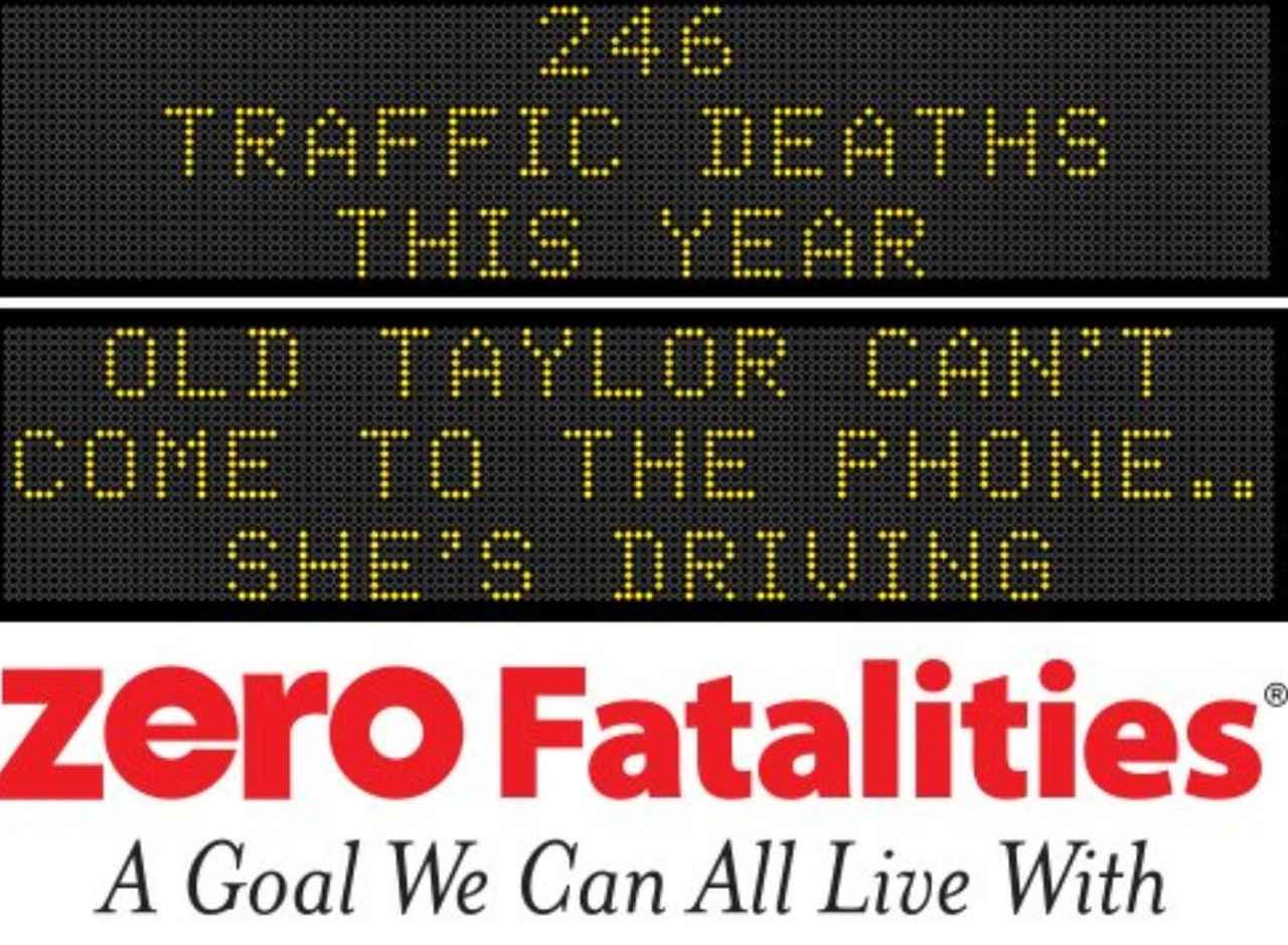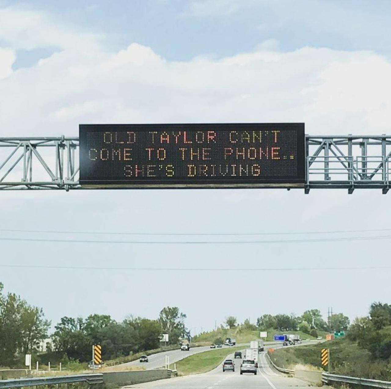 アイオワ州運輸省は、今週、公式ツイッターで「交通事故死亡者数ゼロを目指して」というスローガンとともに、「今年の交通事故死者数は246人」という表示と「Old Taylor Can’t Come to the Phone.. She’s Driving」(昔のテイラーは今電話にでることができません…彼女は運転中だから)」と、運転中のスマホ使用を防止するメッセージが書かれた電光掲示板の写真を公開。