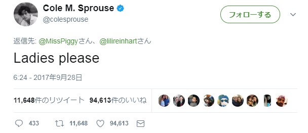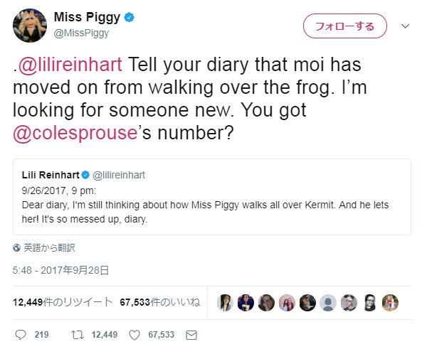 ディズニーチャンネルのドラマ『スイートライフ』で人気子役としてブレイクし、現在はドラマ『リバーデイル』に出演しているコール・スプラウス。そんなコールと現在熱愛のウワサが流れている同ドラマの共演女優リリ・ラインハートが、ツイッターで「ザ・マペッツ」で知られるミス・ピギーと元カレのカーミットについて言及。