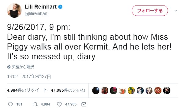「日記へ。ミス・ピギーがカーミットをこき使う様子について、いまだに考えちゃうわ。しかも、カーミットはそれを許してるのよ! もうめちゃくちゃよね」と話したツイートは4万以上ものいいねがついた。