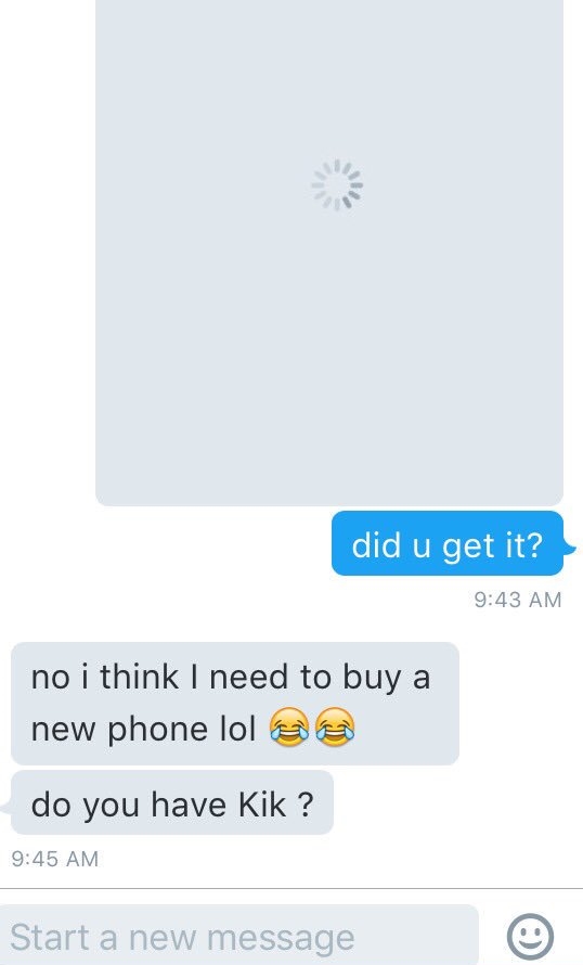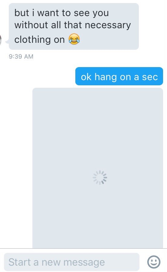 みなさん、もうお気づきだろうか? 実はこれ、「読み込み中」のマークの画像なのだ。いつまで経っても読み込まれないのは当たり前。だってこの男性はすでに写真を受信しているのだから。裸の写真だと思ってなんとか見たい男性と、冷静に読み込み中の画像を送り続ける女性。