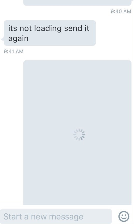 しかし、女性が公開した実際のやり取りを見て頂ければわかるように、画面には「読み込み中」を意味するマークが表示されており、肝心の写真を受信することができない。写真の容量が大きすぎる時やインターネット環境が悪い時に起こるこの現象。男性から「読み込まれない。もう一回送って」と再送信をお願いされ、改めて送るも、結局1枚目の写真と同じ状態に。