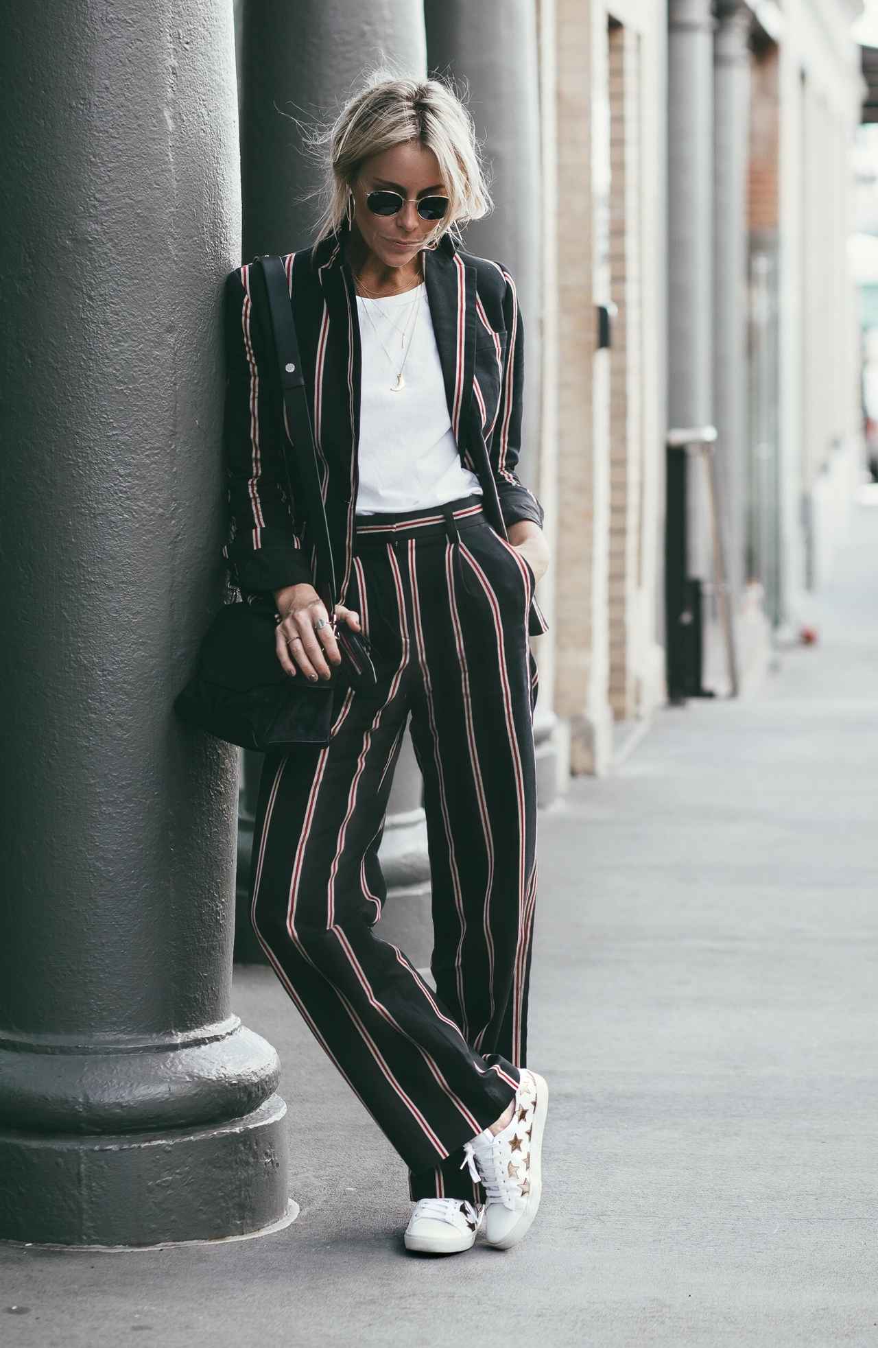 ストライプ柄でマニッシュ感たっぷりのセットアップは、遊び心あふれる星柄スニーカーを投入し、こなれたカジュアルスタイルに落とし込んで。インナーも白Tシャツでラフに。