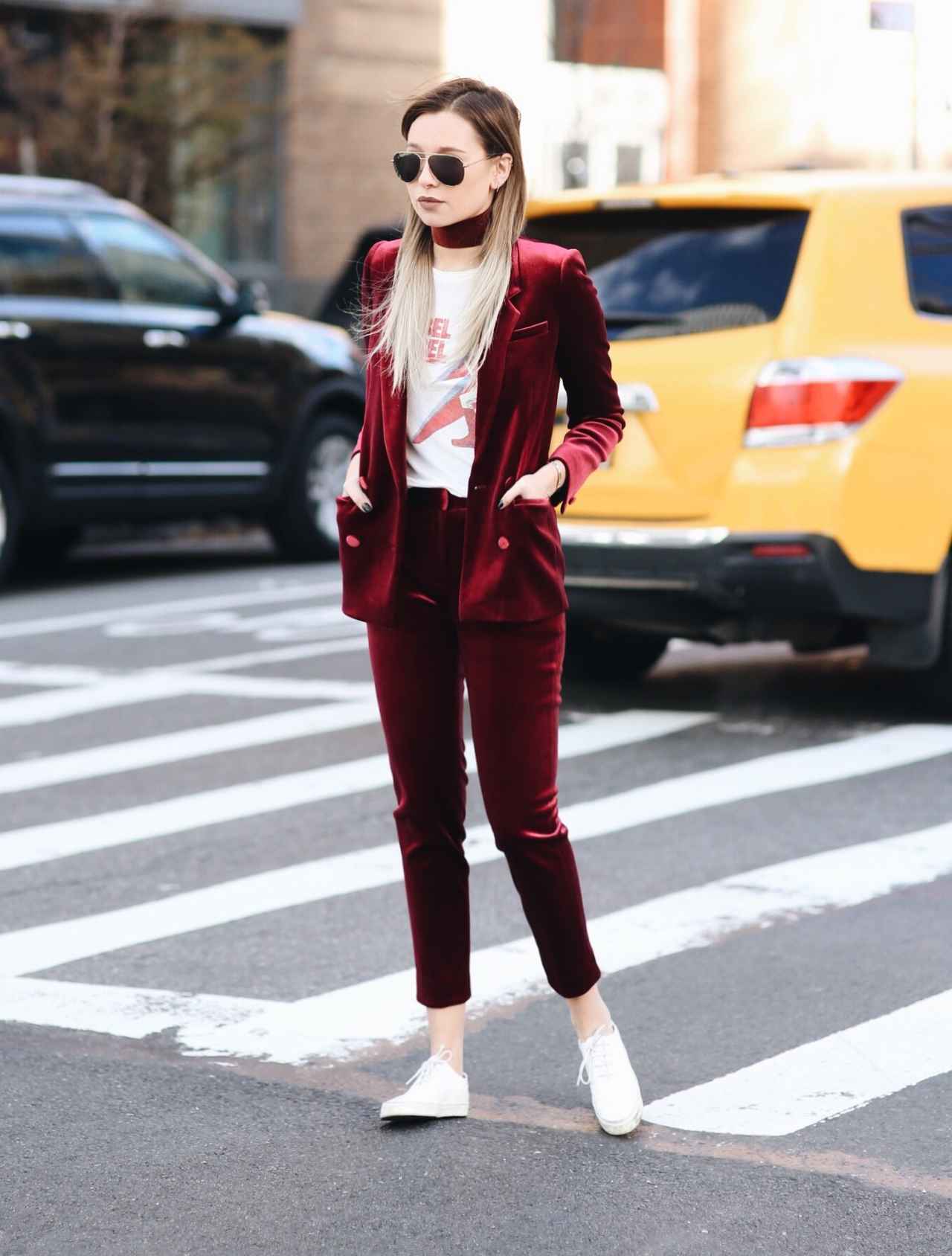 ダニエルは、今秋もトレンドのベルベット素材のセットアップをTOPSHOPからチョイスし、ヴィンテージのロゴTシャツと、KAREN GALLOの白スニーカーでキメすぎずにエフォートレス。