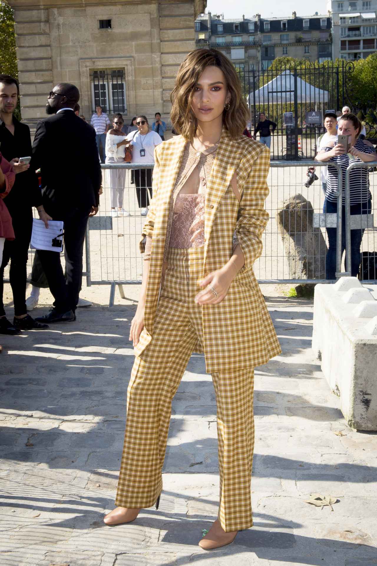 Nina Ricci の2017秋冬コレクションから黄色のチェック柄セットアップを着こなしたエミリー。レーシーなインナーで肌をのぞかせ、その上にベージュのカーディガンをレイヤーしたのが技あり。袖はまくって抜け感を出して。