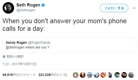 出掛けている時に親に連絡するのを忘れて、親から何度も連絡が来るというのは、経験したことがある人もたくさんいるはず。なんと人気コメディ俳優のセス・ローゲンは、1日母親に連絡したなかったおかげで、ツイッター上で捜索されてしまった。